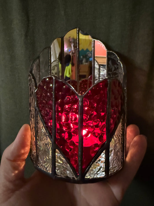 Stainedglass candle holders. Each one uniquely different. All designed by Nicky Dierens