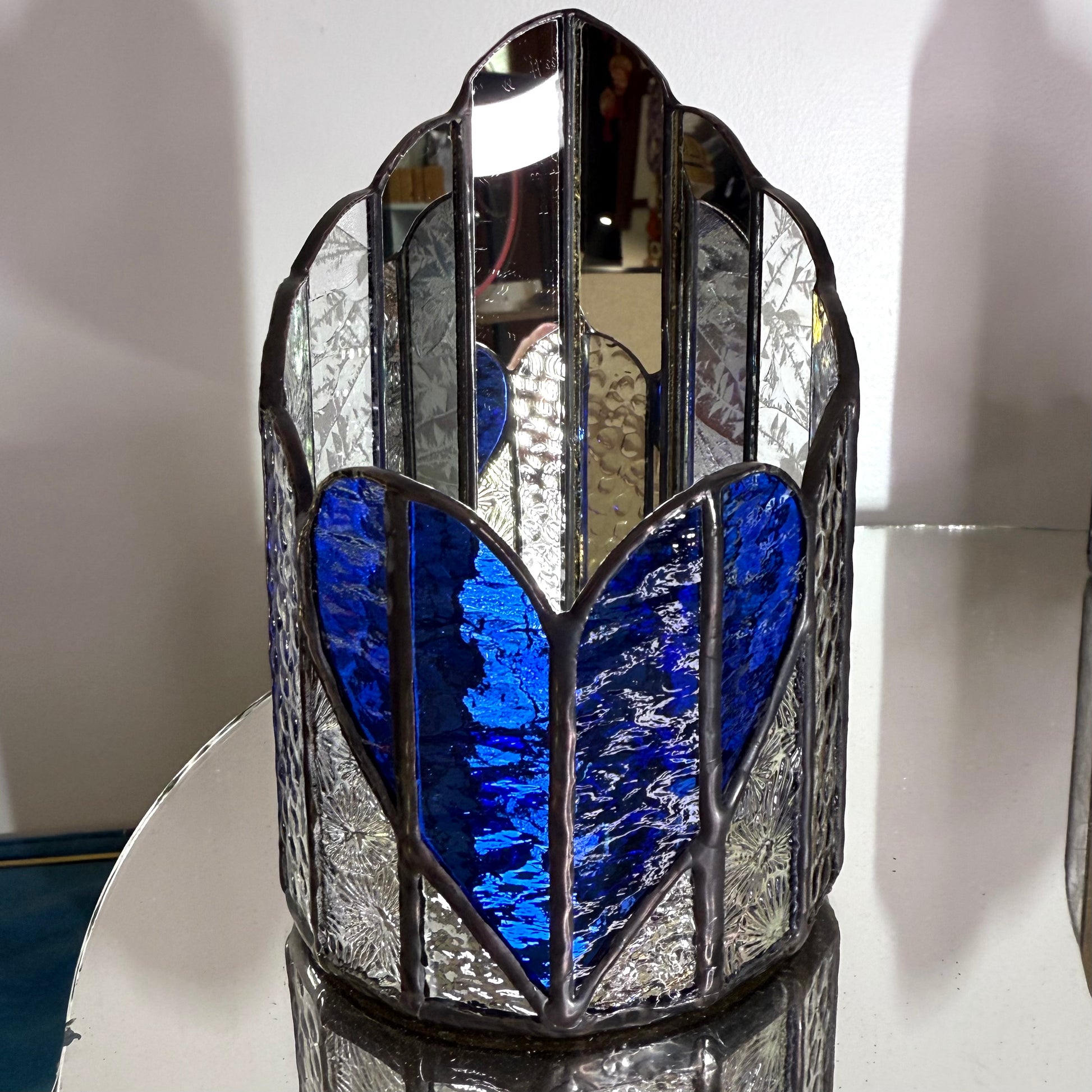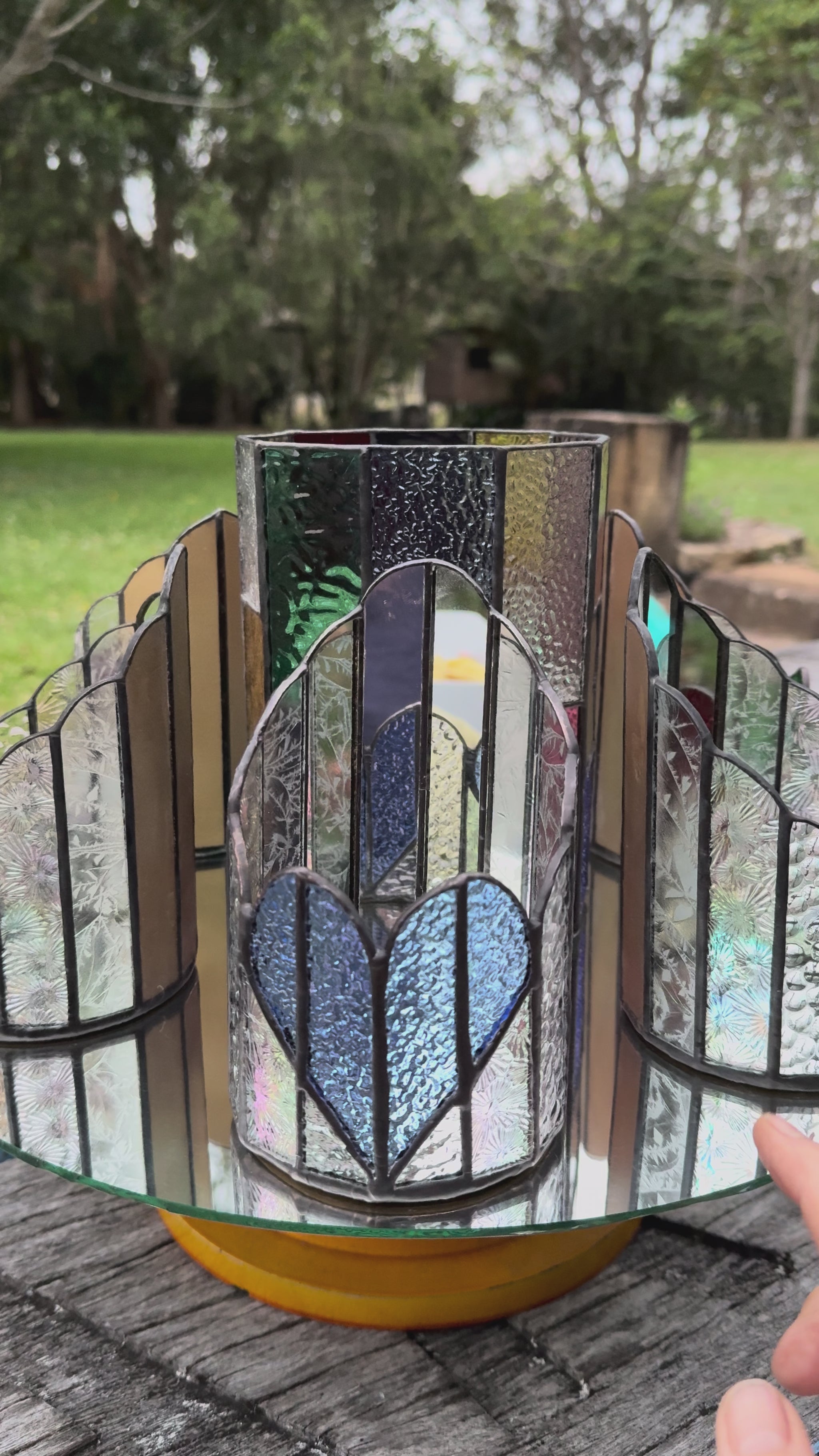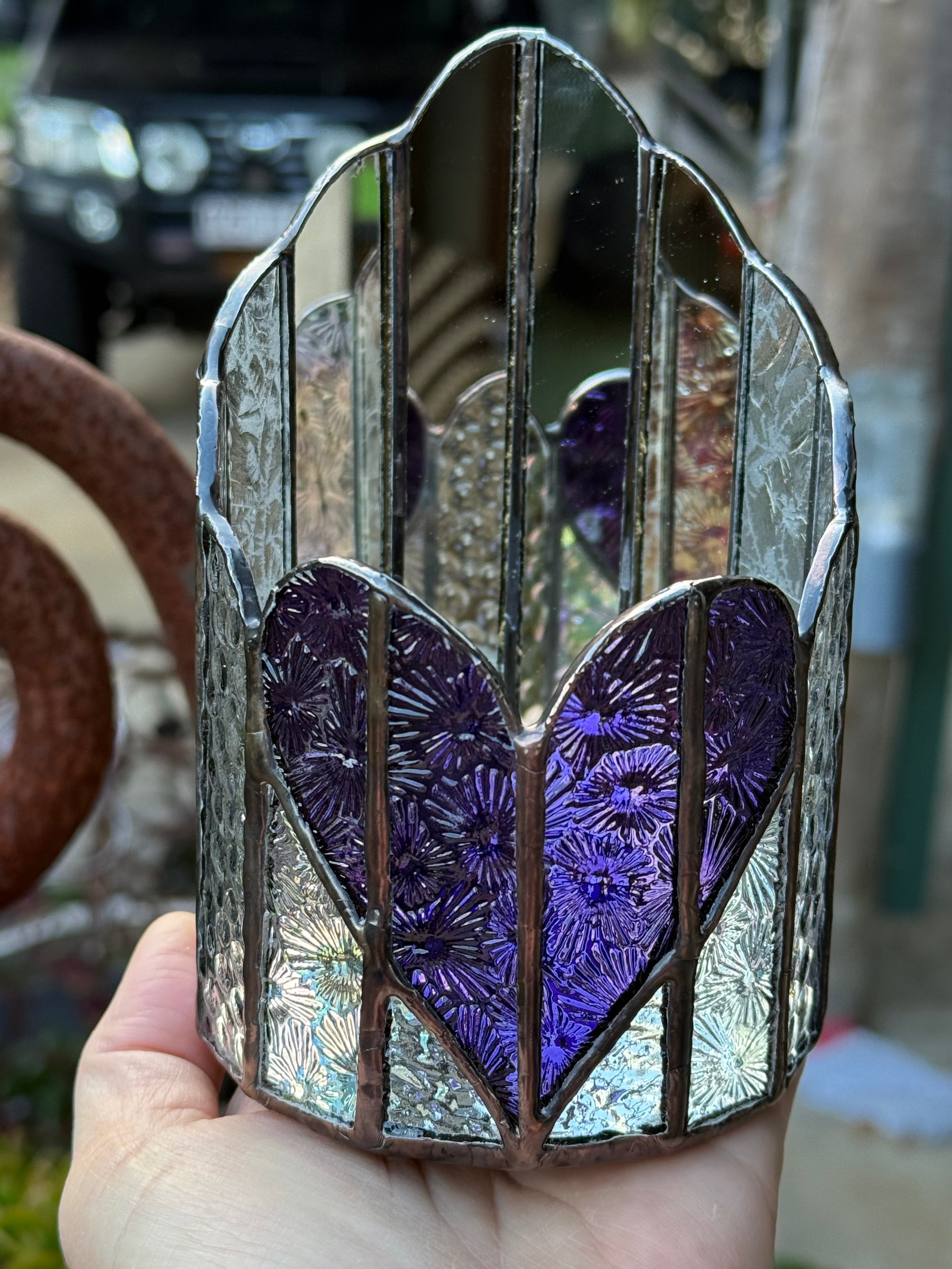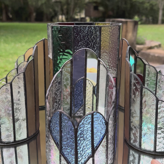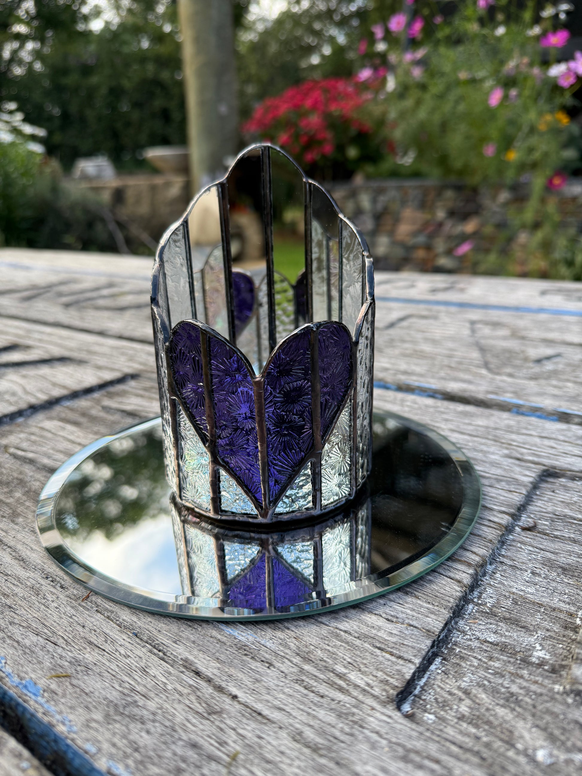 Stainedglass candle holder with a red heart, textured clear and mirror.